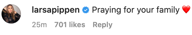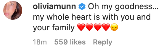 Comedian Chelsea Handler commented, “Sending you all my love on and on,” while Olivia Munn wrote, “Oh my goodness… my whole. Heart is with you and your family. ❤️❤️❤️❤️😔.”
