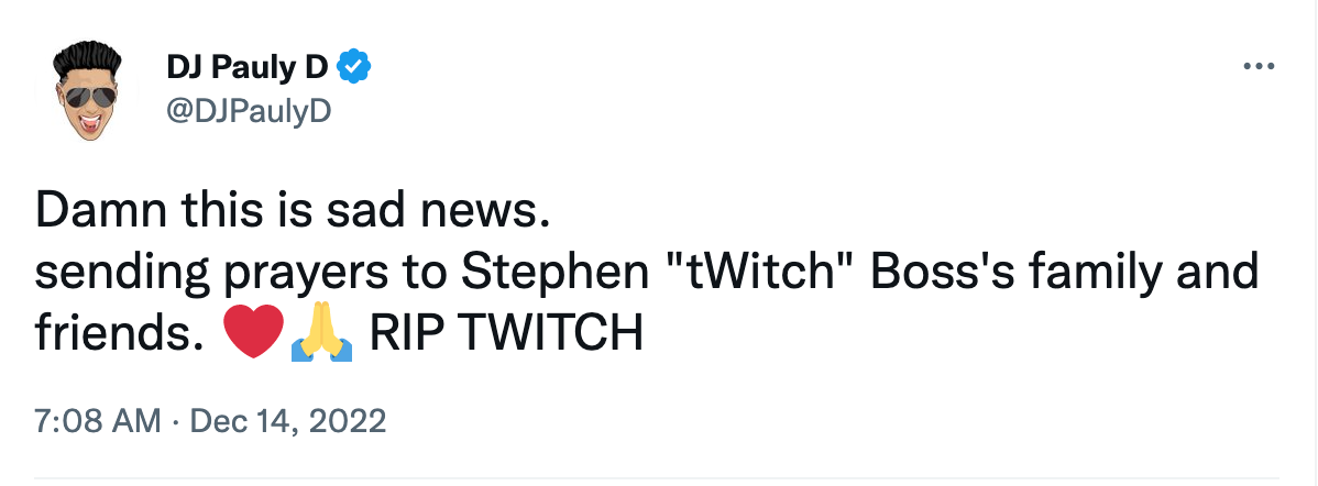 DJ Pauly D tweeted, “Damn this is sad news. Sending prayers to Stephen ‘tWitch” Boss’s family and friends. ❤️🙏🏽 RIP TWITCH.”