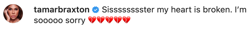 Tamar Braxton also commented on Holker’s post, “Sisssssssster my heart is broken. I’m soooo sorry 💔💔💔💔💔.”