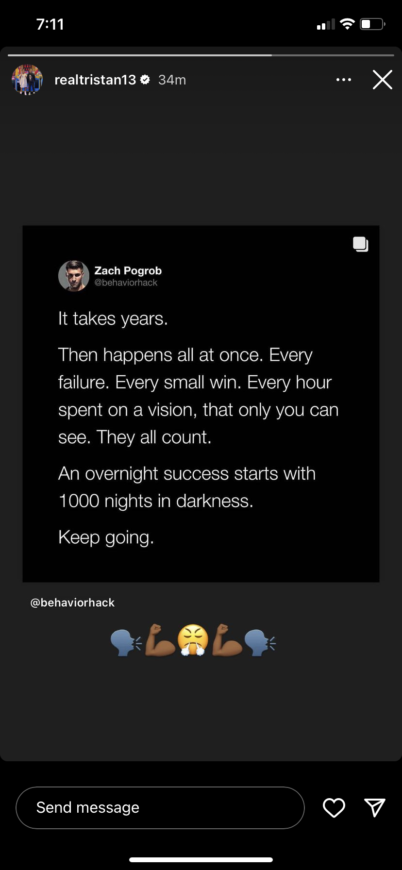 “It takes years. Then happens all at once. Every failure. Every small win. Every hour spent on a vision, that only you can see. They all count,” the quote read. “An overnight success starts with 1000 nights in darkness. Keep going.”