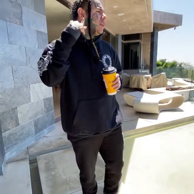 But, in the video, Tekashi is standing in the backyard of a mansion in the Hollywood Hills, and jokes about giving any gang members looking for retaliation a head start in finding him!