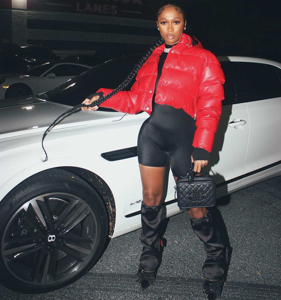 The 22-year-old up-and-coming rapper posted a series of sizzling shots on her Instagram. Dess is seen rocking a tight black bodysuit with a pair of oversized boots. She threw on a red puffy winter coat and added a Chanel bag to spice up the ensemble.