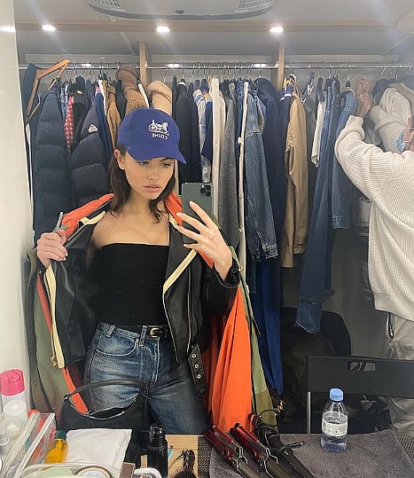 Thylane’s photo, seeing her backed by rows of clothing, came as a selfie. The Aix-en-Provence native was teasing open her khaki-and-orange jacket while standing in belted jeans, also flashing her trim shoulders via her black tube top reveal.