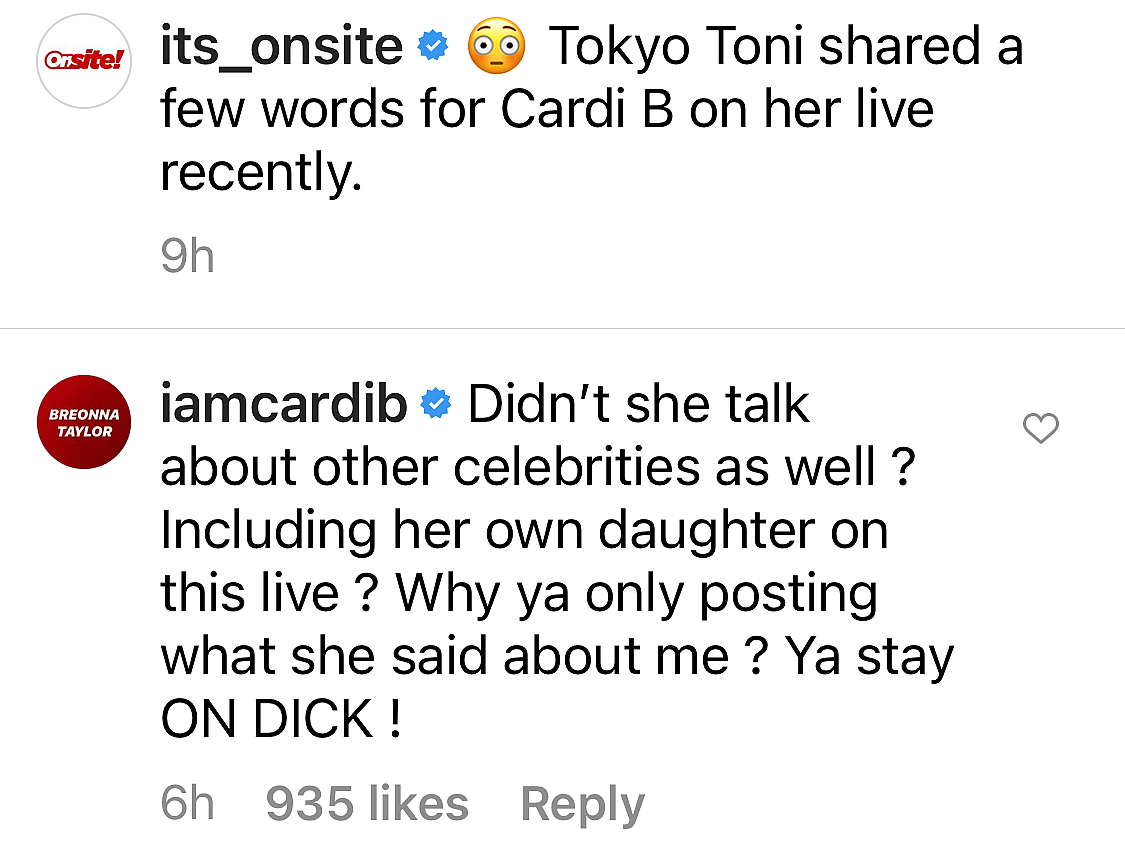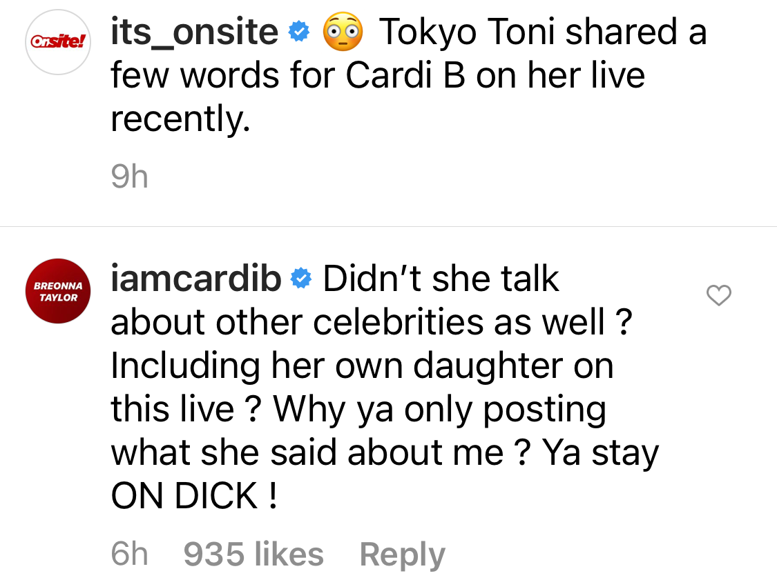 Cardi caught the video and wasn’t impressed with Tokyo. She said, “Didn’t she talk about other celebrities as well? Including her own daughter on this live? Why ya only posting what she said about me? Ya stay on DICK!”