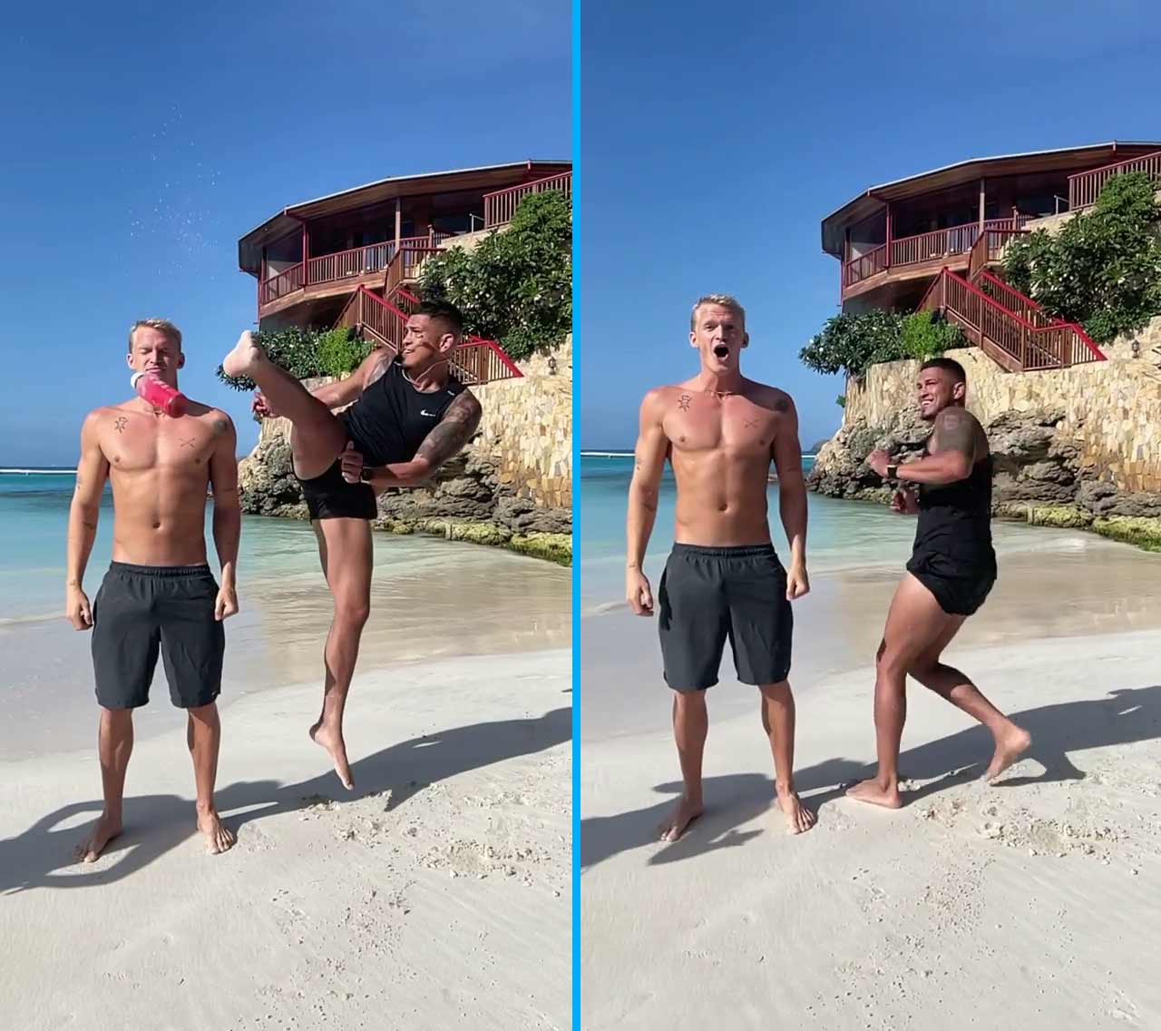 Simpson is currently training for the 2024 Olympics in St. Barts. Pettis and he seem to be staying at a beautiful property called the Vital Wellness House, paid for by the sports drink, Vital Performance. Cody is really brave to participate in a little promotional stunt with the MMA veteran.