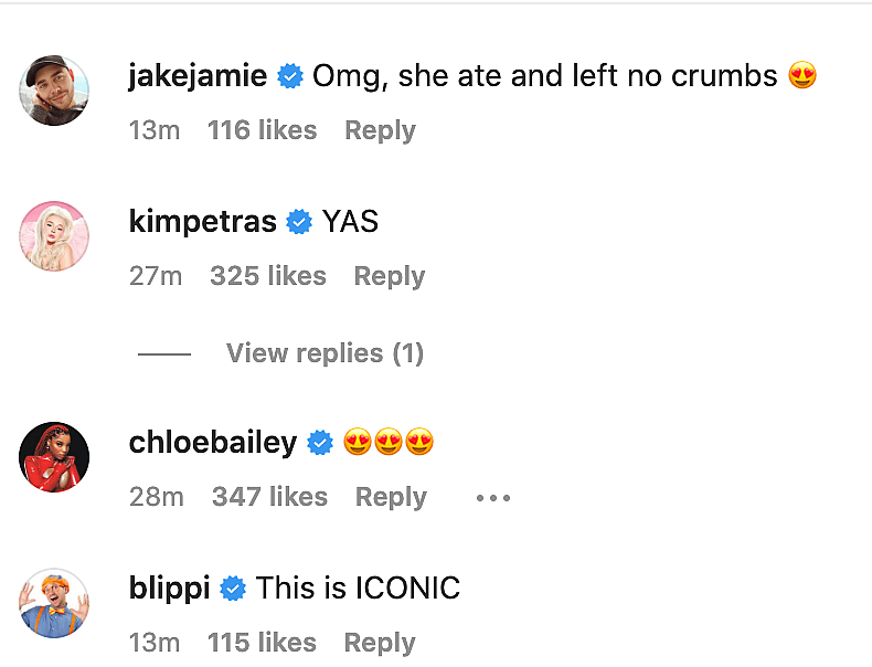 Kim Petras commented, “YAS,” while Nikkie Tutorials commented, “HARD SLAY 🔥.”