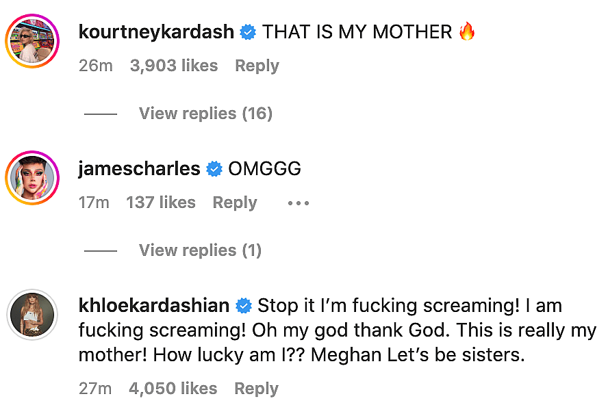 “Stop it I’m f***ing screaming! I am f***ing screaming! Oh my god thank God. This is really my mother! How lucky am I?? Meghan Let’s be sisters,” Khloe Kardashian wrote.