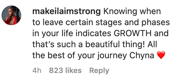 “Knowing when to leave certain stages and phases in your life indicates GROWTH and that’s such a beautiful thing! All the best of your journey Chyna,” another added.
