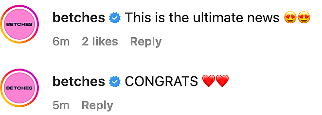 Instagram account @betches commented, “This is the ultimate news 😍😍. CONGRATS ❤️❤️.”