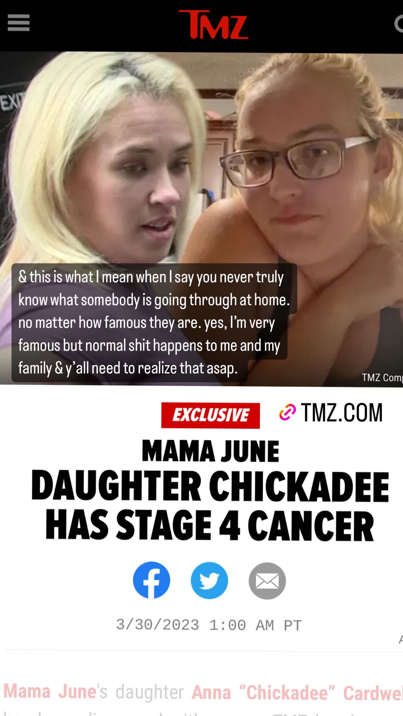 Here Comes Honey Boo Boo star Anna “Chickadee” Cardwellrevealed her stage 4 cancer diagnosis after multiple stomach aches.