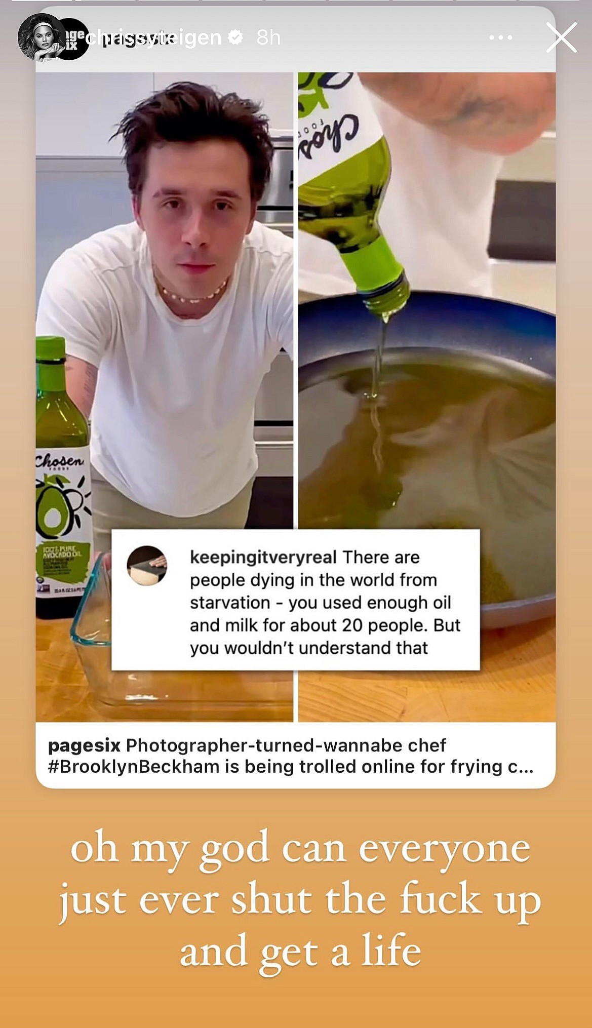 Underneath this critic’s opinion, the Utah beauty called out haters to leave Beckham alone. “Oh my God, can everyone just ever shut the f**k up and get a life,” Teigen clapped back. Her response to trolls came a day after the 24-year-old shared his fried chicken recipe in an Instagram reel.