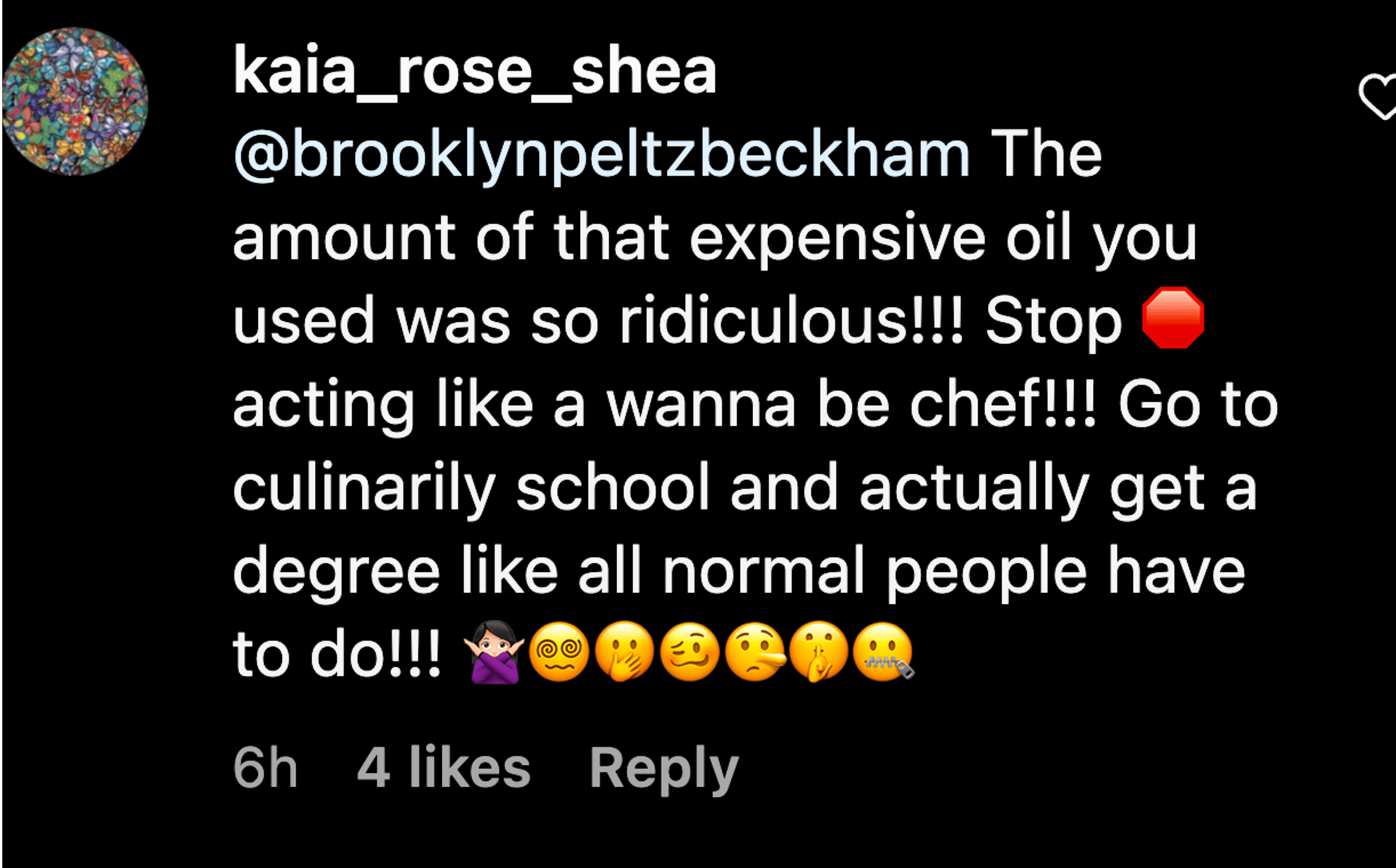 A fellow troll called out the Westminster native for acting like a chef without undertaking the necessary training to be one. The individual wrote: “@brooklynbeckham The amount of that expensive oil you used was ridiculous!!! Stop acting like a wannabe chef!!! Go to culinary school and get a degree like all normal people have to do!!!”