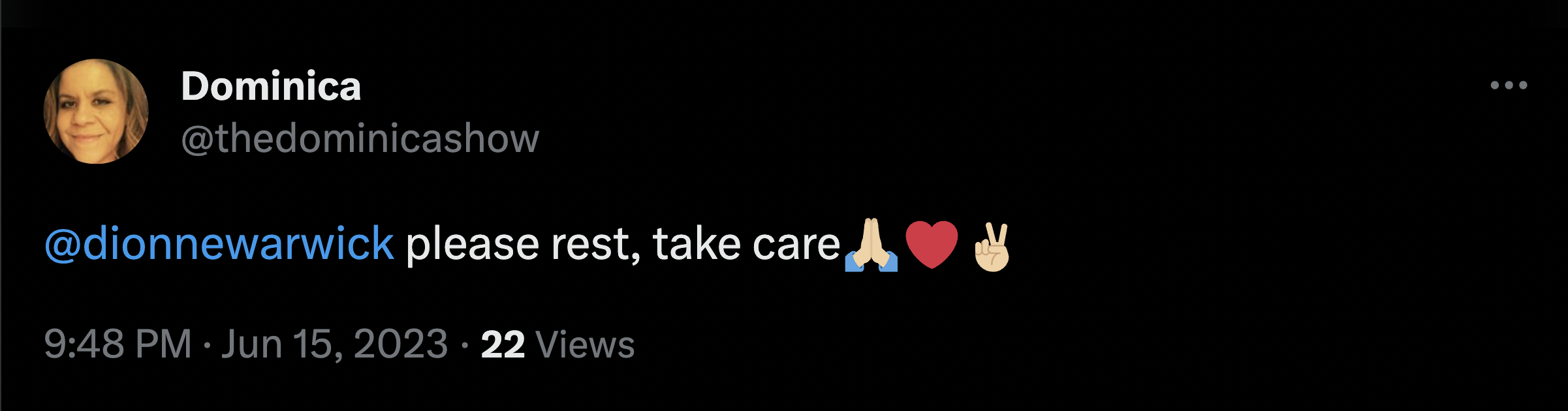 Some took to Twitter, dropping their well wishes for the singer. “Wishing 👑ueen @dionnewarwick speedy recovery. 🙏🏾💖,” one Warwick admirer wrote. Another fan tweeted, “Sending prayers.” Sharing a similar good wish, a third admirer tweeted, “Hope you’re feeling better soon! @dionnewarwick,” a fourth follower quipped, “Sending love and healing vibes to @dionnewarwick.”