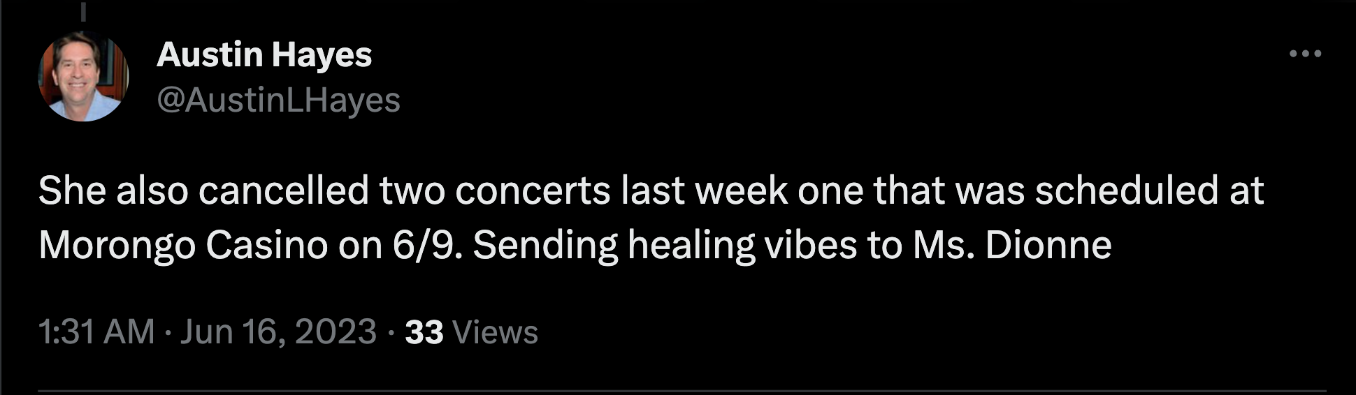 Another good wisher advised the singer to “rest and take care.” One concerned individual highlighted that other shows the celebrated musician canceled before saying a prayer for her. According to the individual, “She also canceled two concerts last week, one scheduled at Morongo Casino on 6/9. Sending healing vibes to Ms. Dionne.”