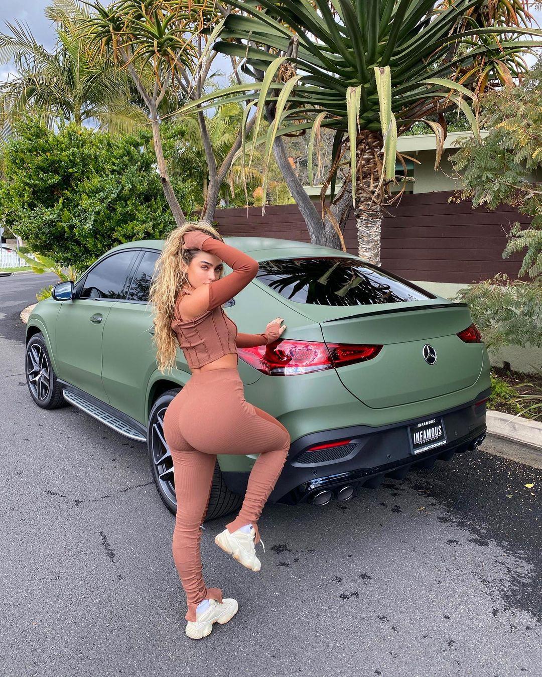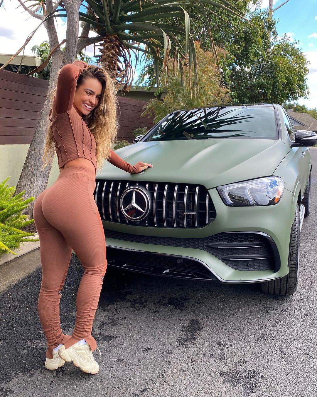 The fitness model just sent Instagram into a tailspin after revealing the military green wrap job on her new Mercedes — and posing with it wearing a set of skintight workout spandex!