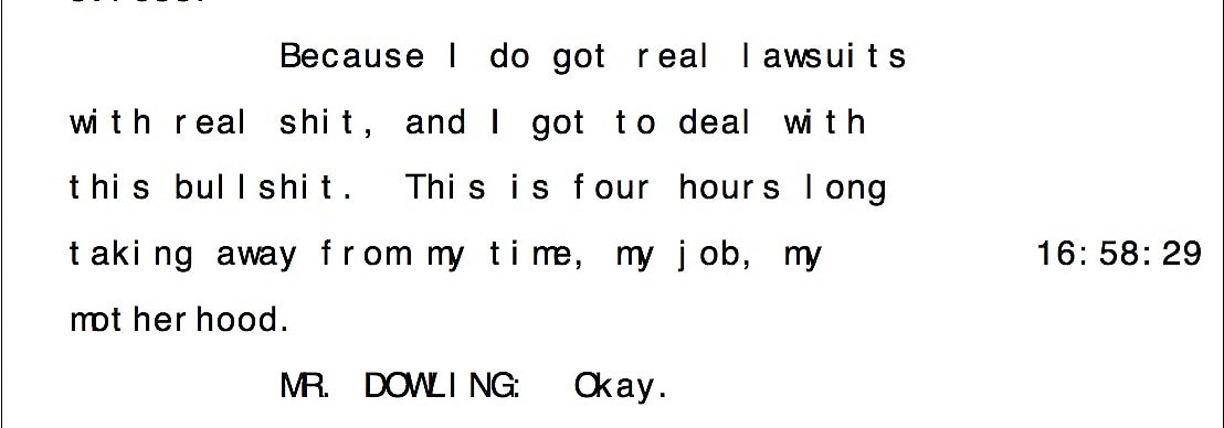 The deposition ended shortly after she laid it all out.