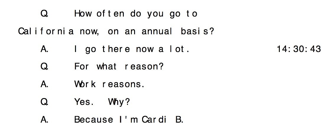 Brophy’s lawyer asked Cardi about how often she comes to California on an annual basis. She said “I go there a lot.” He pressed asking “For what reason?” to which she said “Work reasons”.
