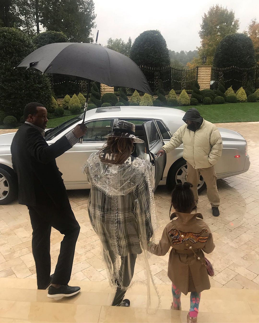 The driver of the car holds an umbrella as they enter the vehicle. She captioned the post, “Not letting a little rain stop our dinner date ☔️? Nana + Elle #bestdateever”