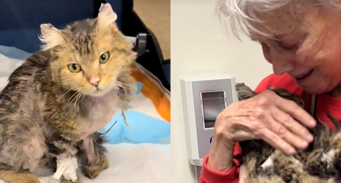 The 82-year-old was beside herself with joy as she carefully approached Aggie, gently stroking the Maine Coon. The poor cat bore the evidence of its struggles on its fur, looking worn out and burnt. Despite its initial bewilderment, Aggie appeared to recognize Katherine once she gently cradled the cat in her arms.