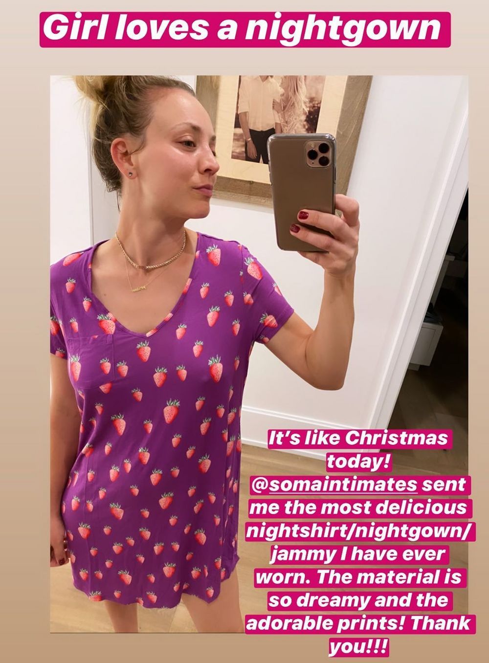 Scroll for the video. The above photo, yet another sleepwear purchase, marked the “delicious” strawberry nightie that’s just part of Kaley’s giant collection. The actress, who made 2020 headlines for deeming her Amazon nightgowns an “essential item” during the pandemic, updated in selfie mode, at the crack of dawn, and speaking blearily into the camera.