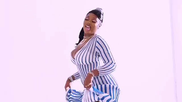 The gorgeous rapper shared a sneak peek of her new music video on Thursday and let’s just say her millions of fans are anxiously waiting to see her back it up when her “Girls in the Hood” vid drops at midnight. Hot Girl Meg looked fantastic in a revealing white dress with blue stripes as she bent at the waist to shake things up.